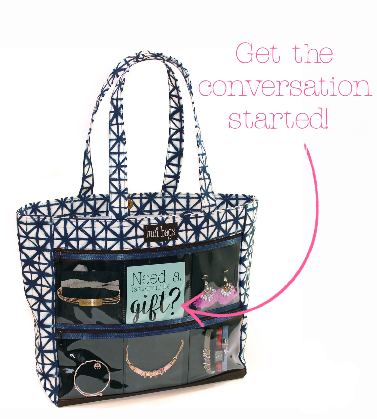 Maximize exposure and reach new customers with a Luci Bags DISPLAY TOTE, designed to promote your business and even sell product right out of your handbag. Showcase a sampling of products in the exterior window pockets. Mix in catalog clippings, photos, and a call-to-action that highlights your brand. Add an ACCESSORY BAG or SMALL POUCH to hold business cards, samples, literature and cash-n-carry product. Now you're ready to advertise everywhere you go.