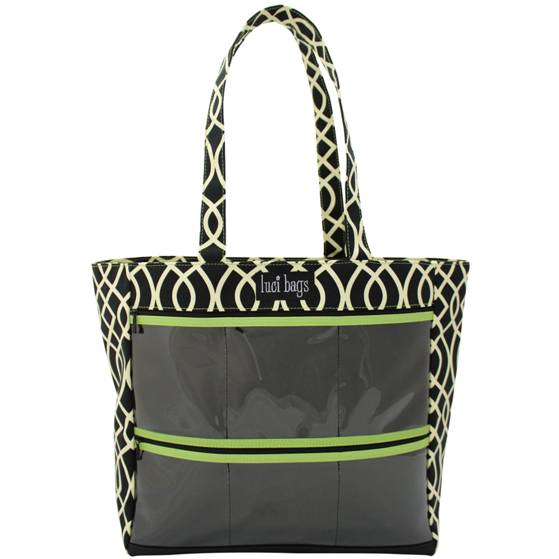 Materials: A clean black and cream lattice print with green apple accents. Black window background & faux leather bottom. Silver magnetic snap closure.