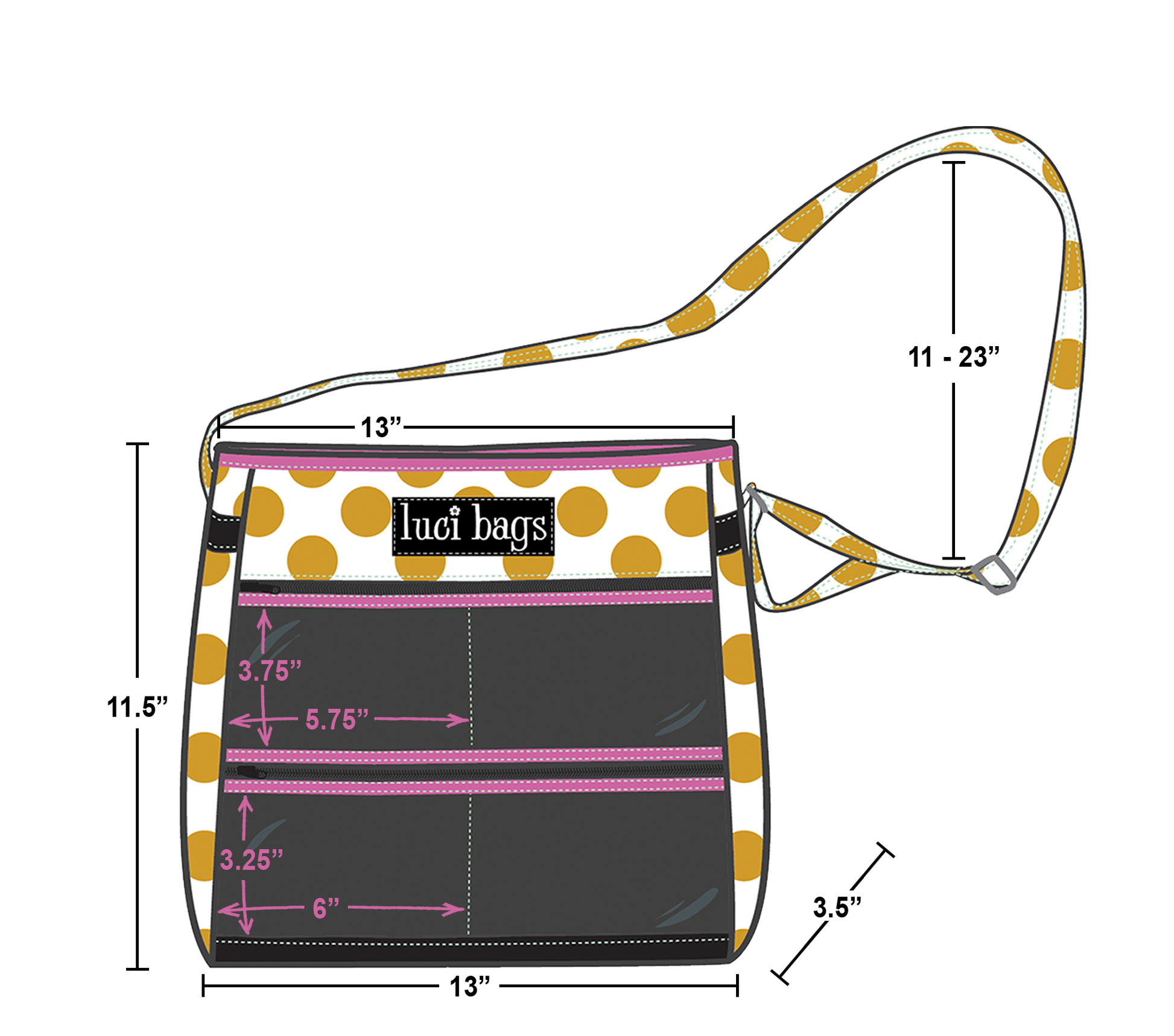 Dimensions: 13" L x 3.75" W x 11.5" H with an 11"-23" adjustable strap