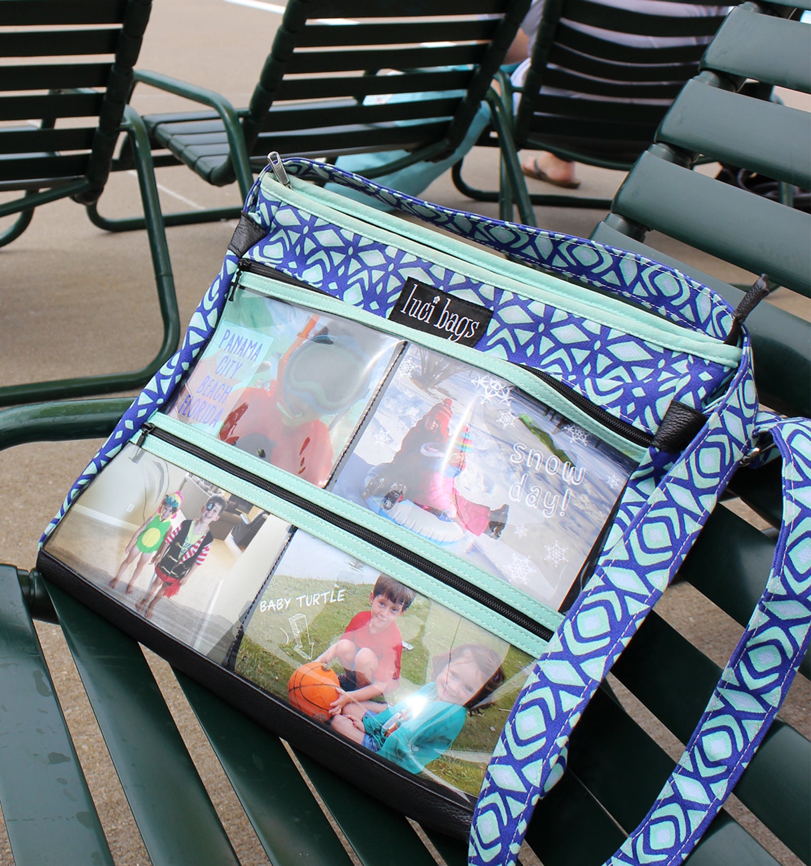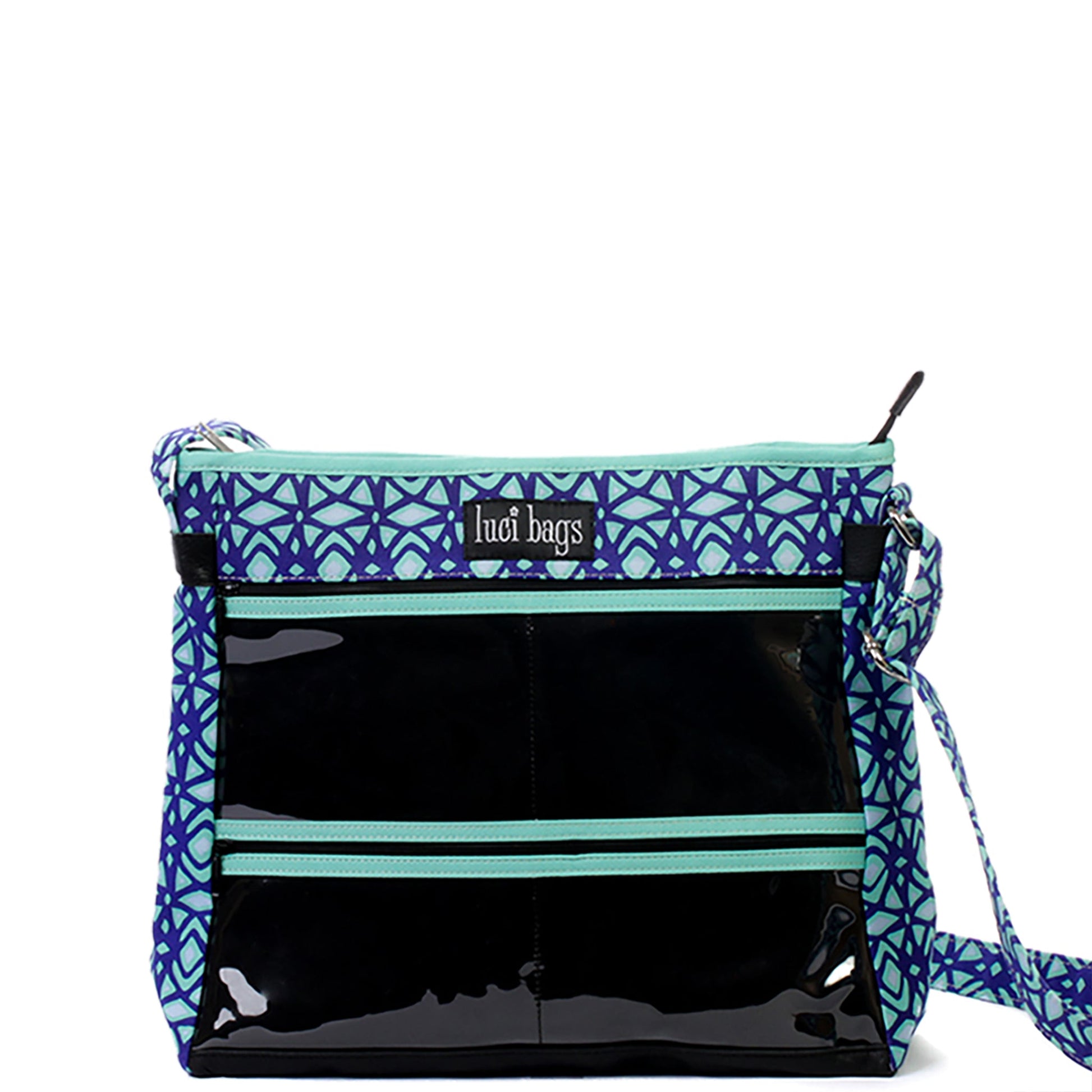 Materials: A striking print combining cobalt blue, turquoise and sky blue. Turquoise accents. Black window background & faux leather bottom. Zip closure.