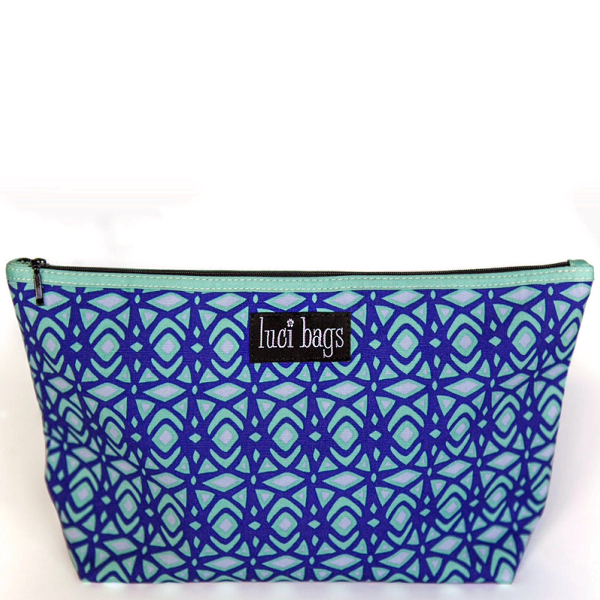 Materials: A striking print combining cobalt blue, turquoise and sky blue. Turquoise accent. Zip closure. One interior zipped pocket.