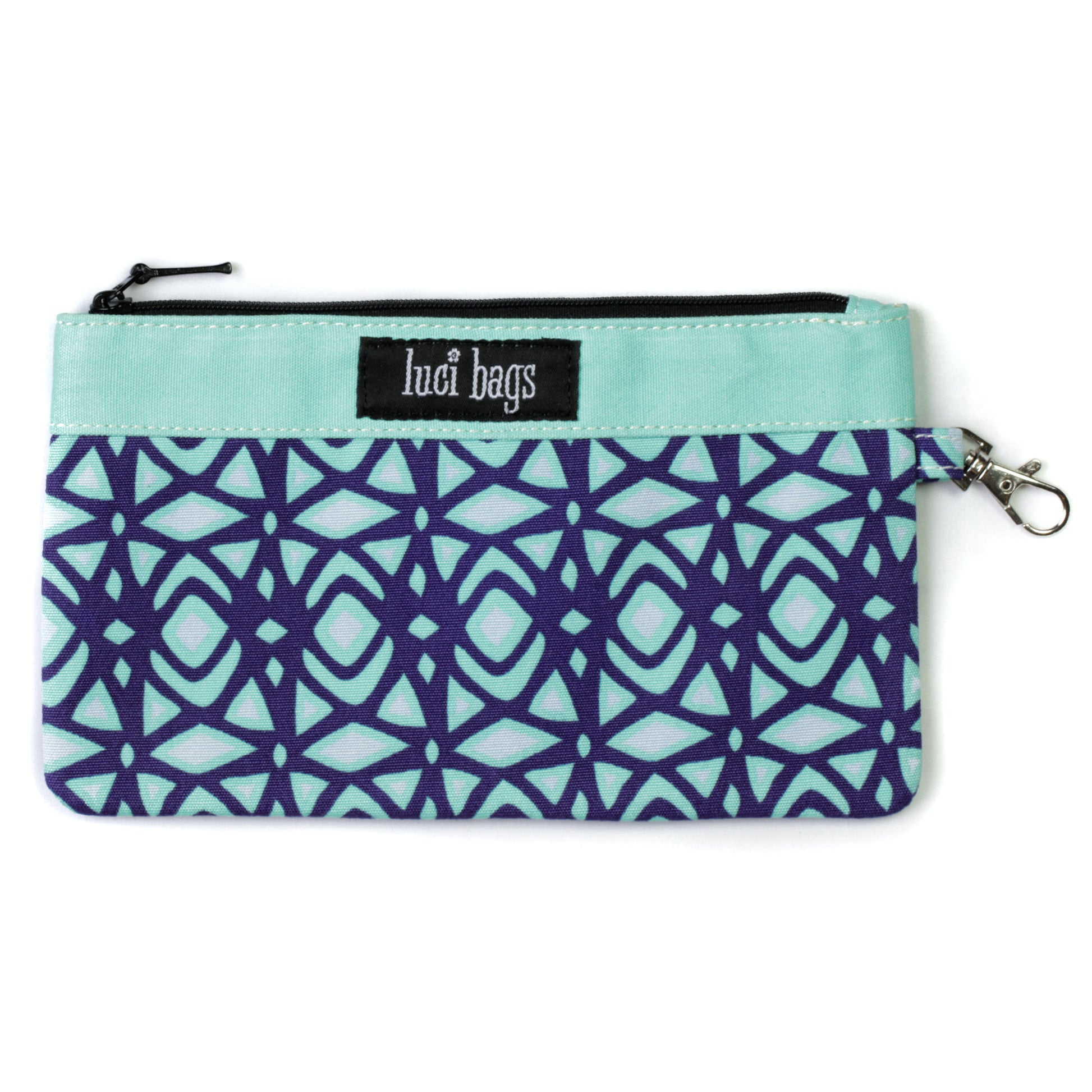 Materials: A striking print combining cobalt blue, turquoise and sky blue. Turquoise accent. Zip closure. Silver claw hook. Interior Pocket.