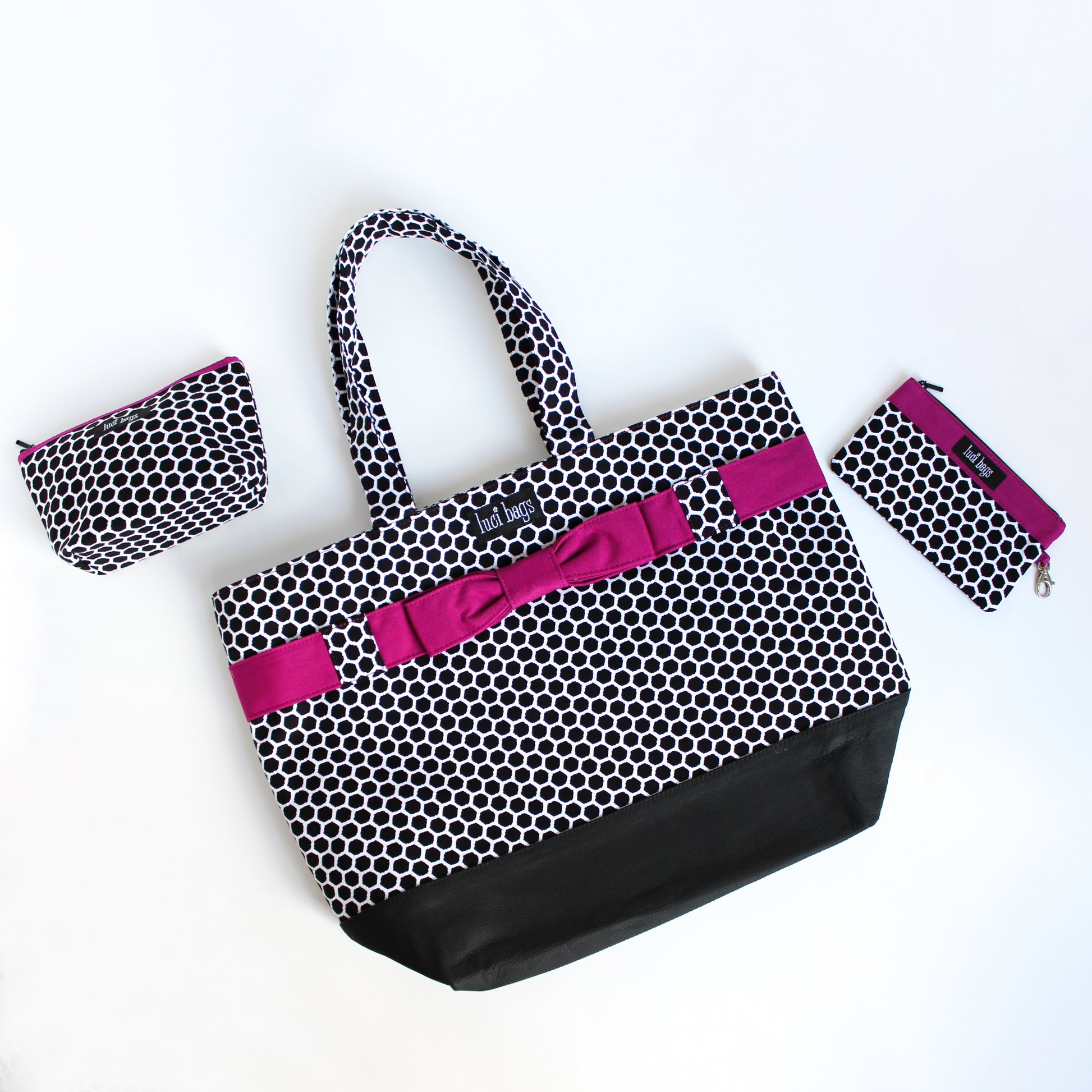 This is the tote bag you've always needed! The Bow Tote makes an excellent beach bag, travel bag, work bag, diaper bag... anything bag. It's simply a huge tote with plenty of interior pockets, a wipeable vegan leather bottom and comfortable extra wide straps.
