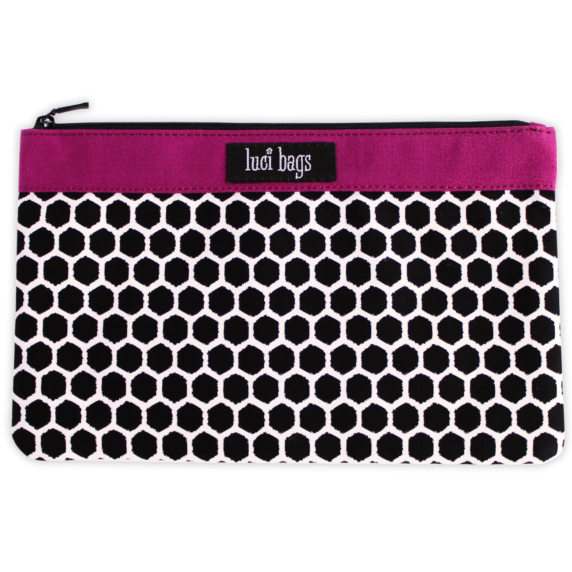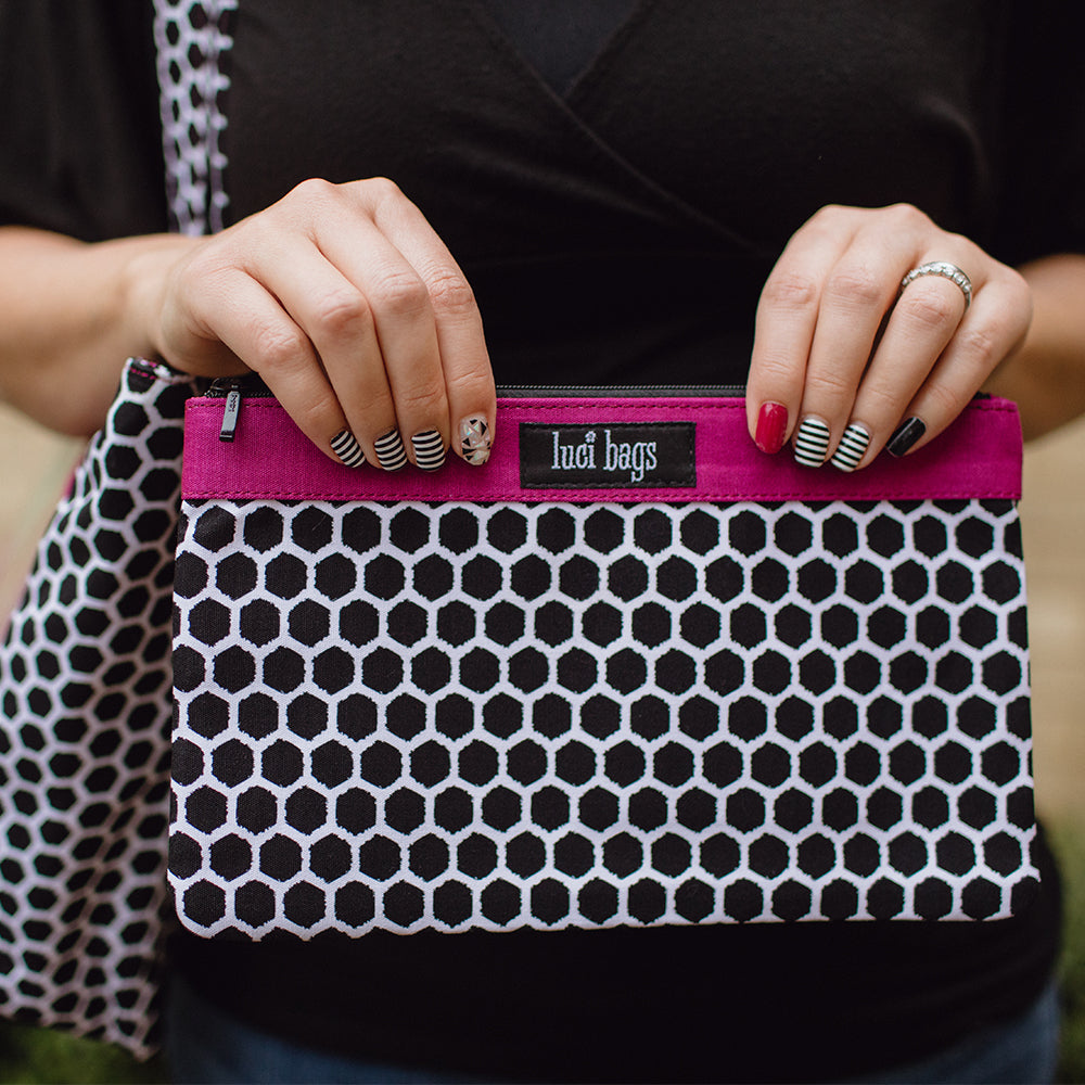 Materials: A geometric black and white honeycomb print accented with the perfect shade of raspberry. Zip closure.