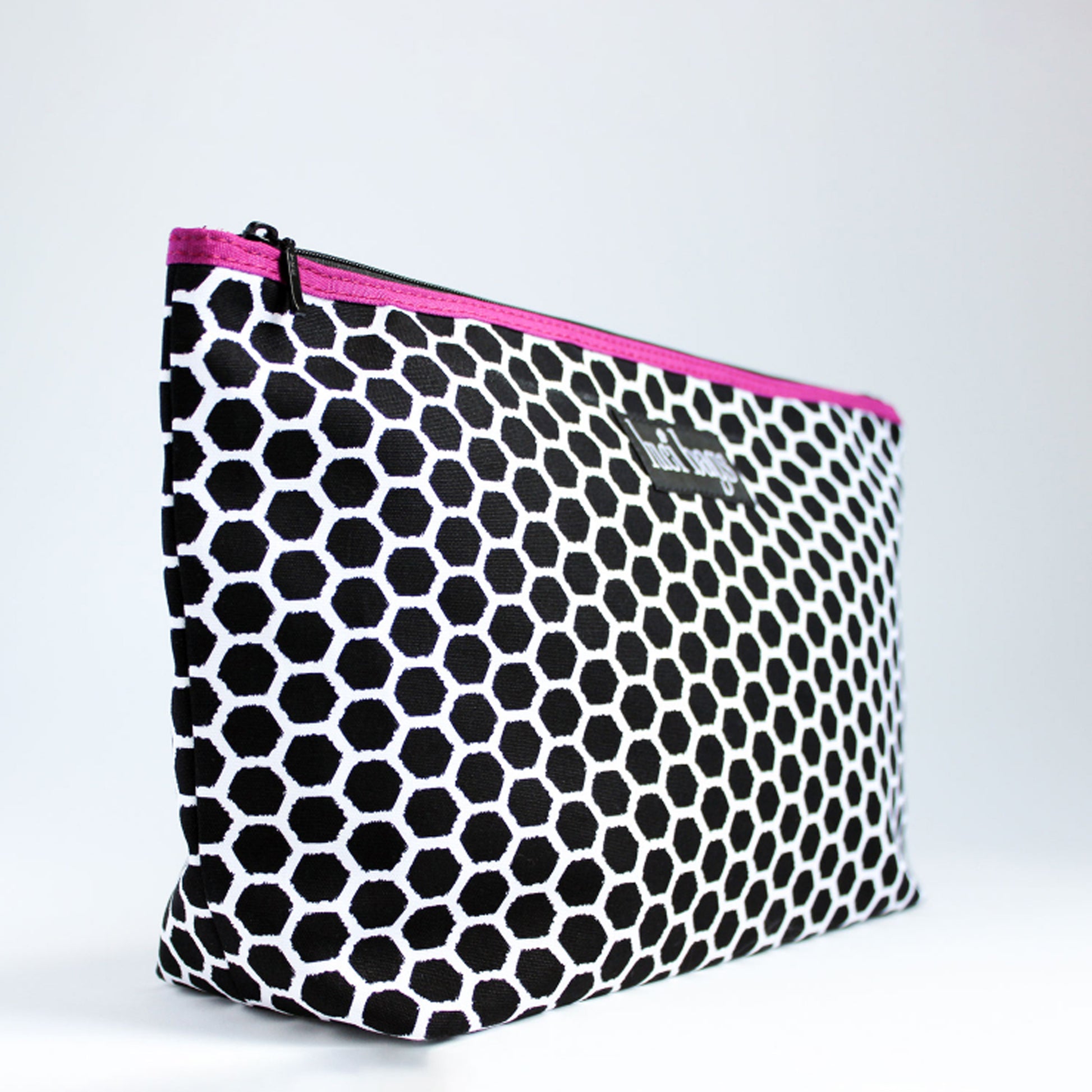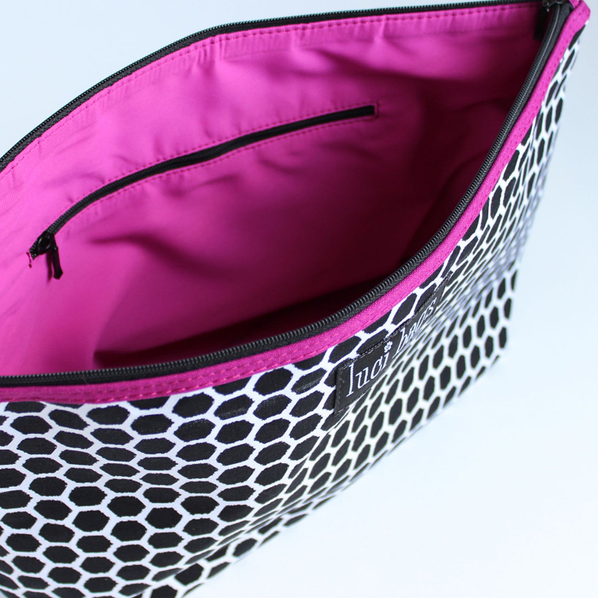 Materials: A geometric black and white honeycomb print accented with the perfect shade of raspberry. Zip closure. One interior zipped pocket.
