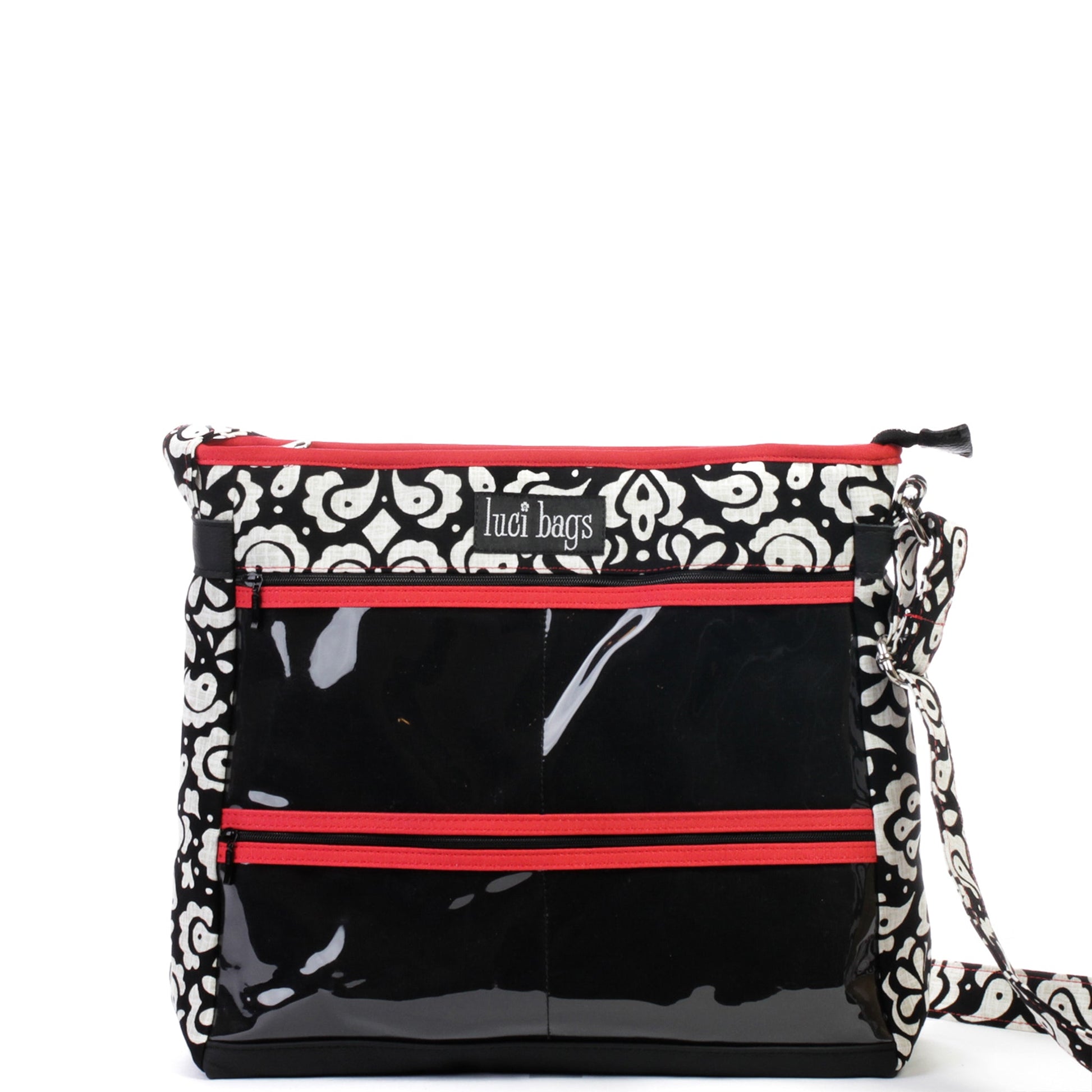 Materials: A classic white and cream mosaic tile print set on a black background. Tomato red accents. Black window background & faux leather bottom. Zip closure.