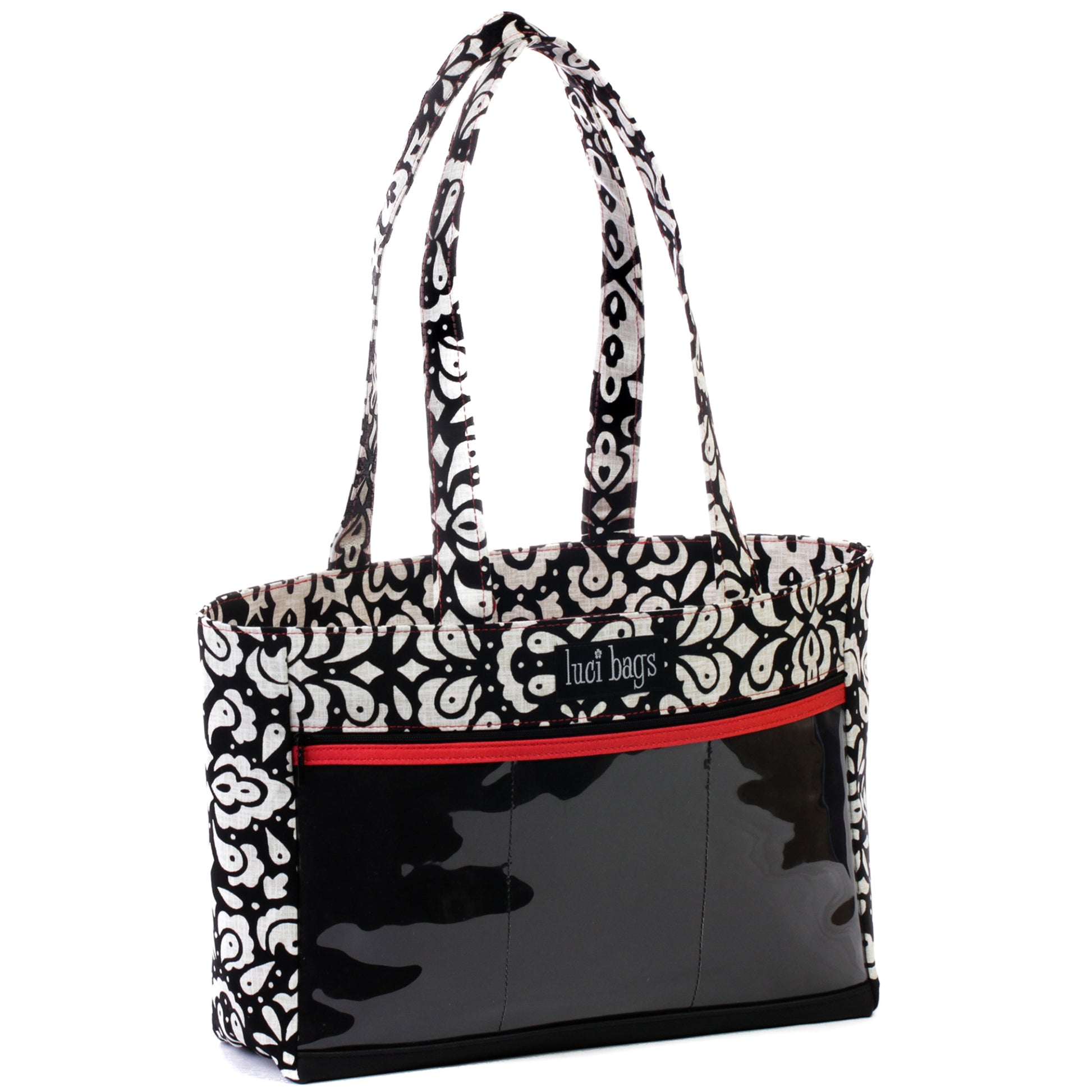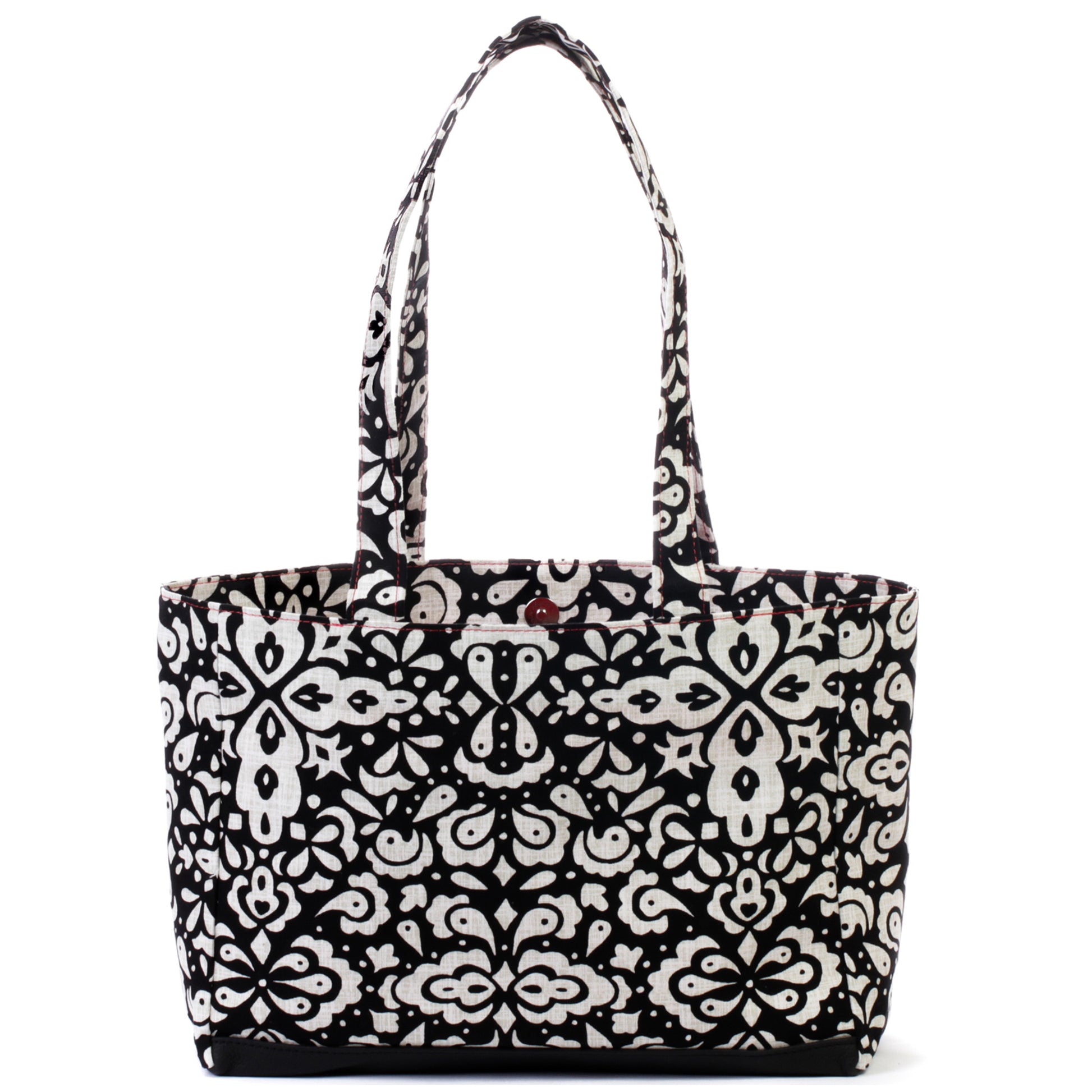 Materials: A classic white and cream mosaic tile print set on a black background. Tomato red accents. Black window background & faux leather bottom. Silver magnetic snap closure.