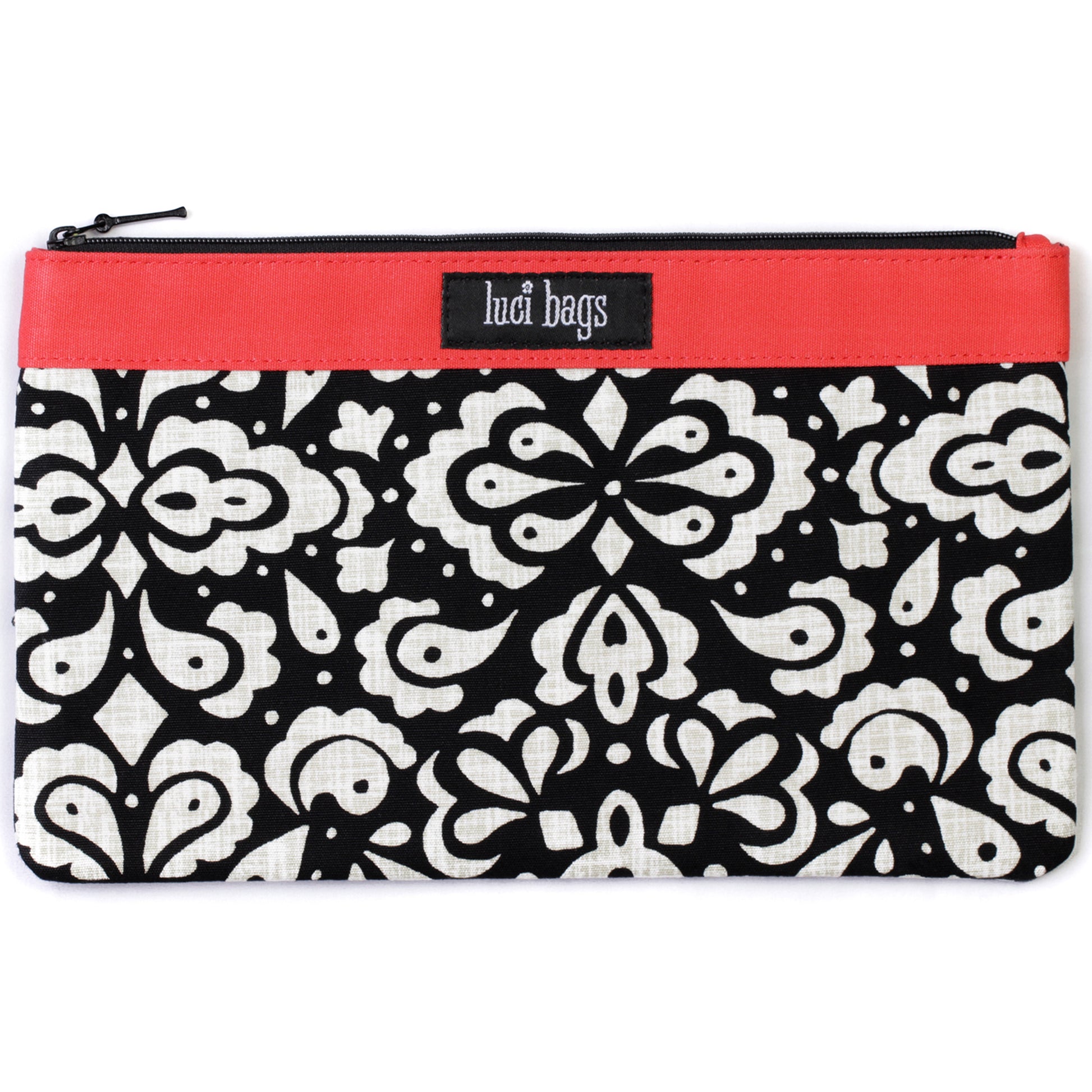 Materials: A classic white and cream mosaic tile print set on a black background. Tomato red accent. Zip closure.