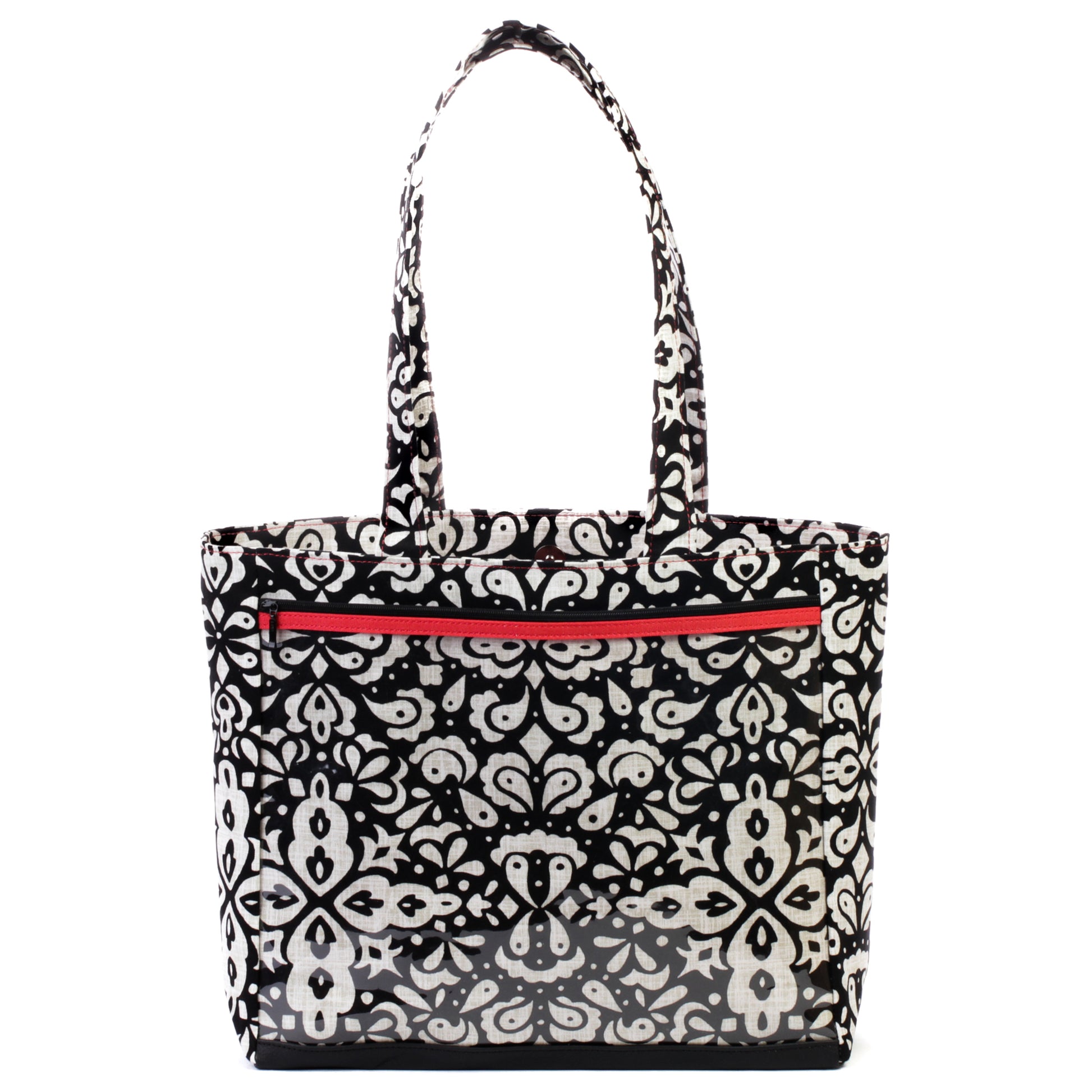Materials: A classic white and cream mosaic tile print set on a black background. Tomato red accents. Black window background & faux leather bottom. Silver magnetic snap closure.