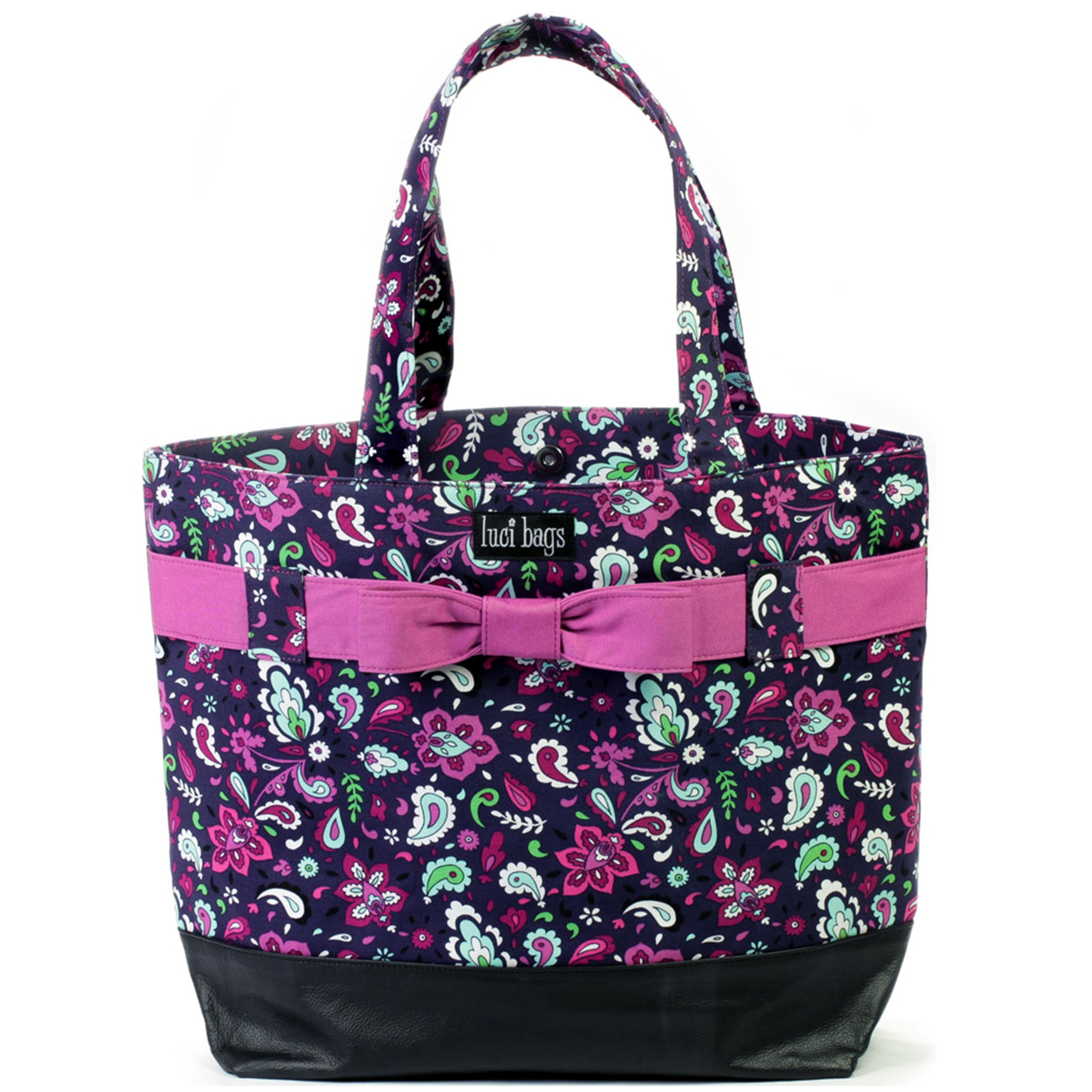 This is the tote bag you've always needed! The Bow Tote makes an excellent beach bag, travel bag, work bag, diaper bag... anything bag. It's simply a huge tote with plenty of interior pockets, a wipeable vegan leather bottom and comfortable extra wide straps.