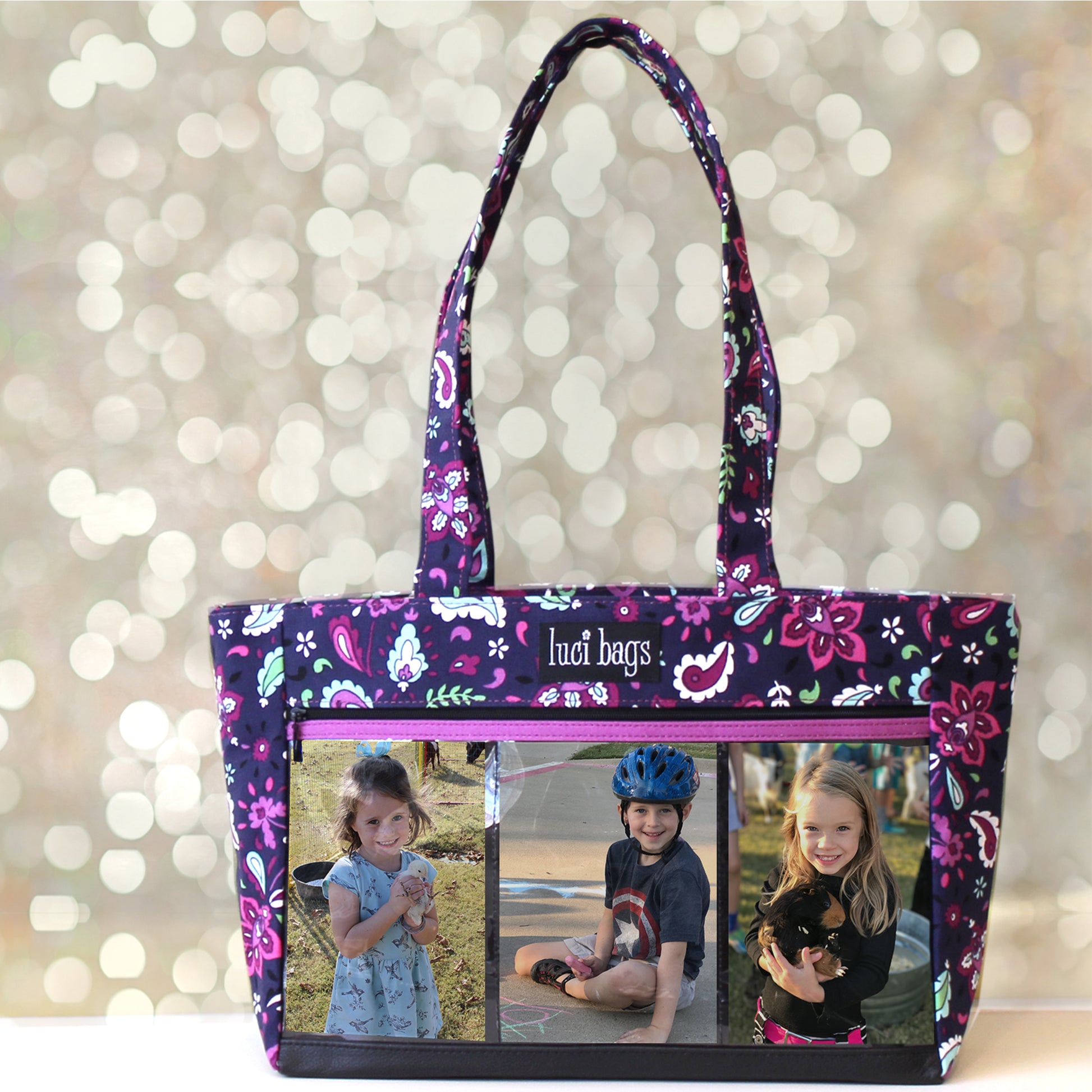 Conveniently sized 4x6" clear pockets on the front make this the perfect brag bag. Quickly display & shuffle photos of little ones or furry friends.