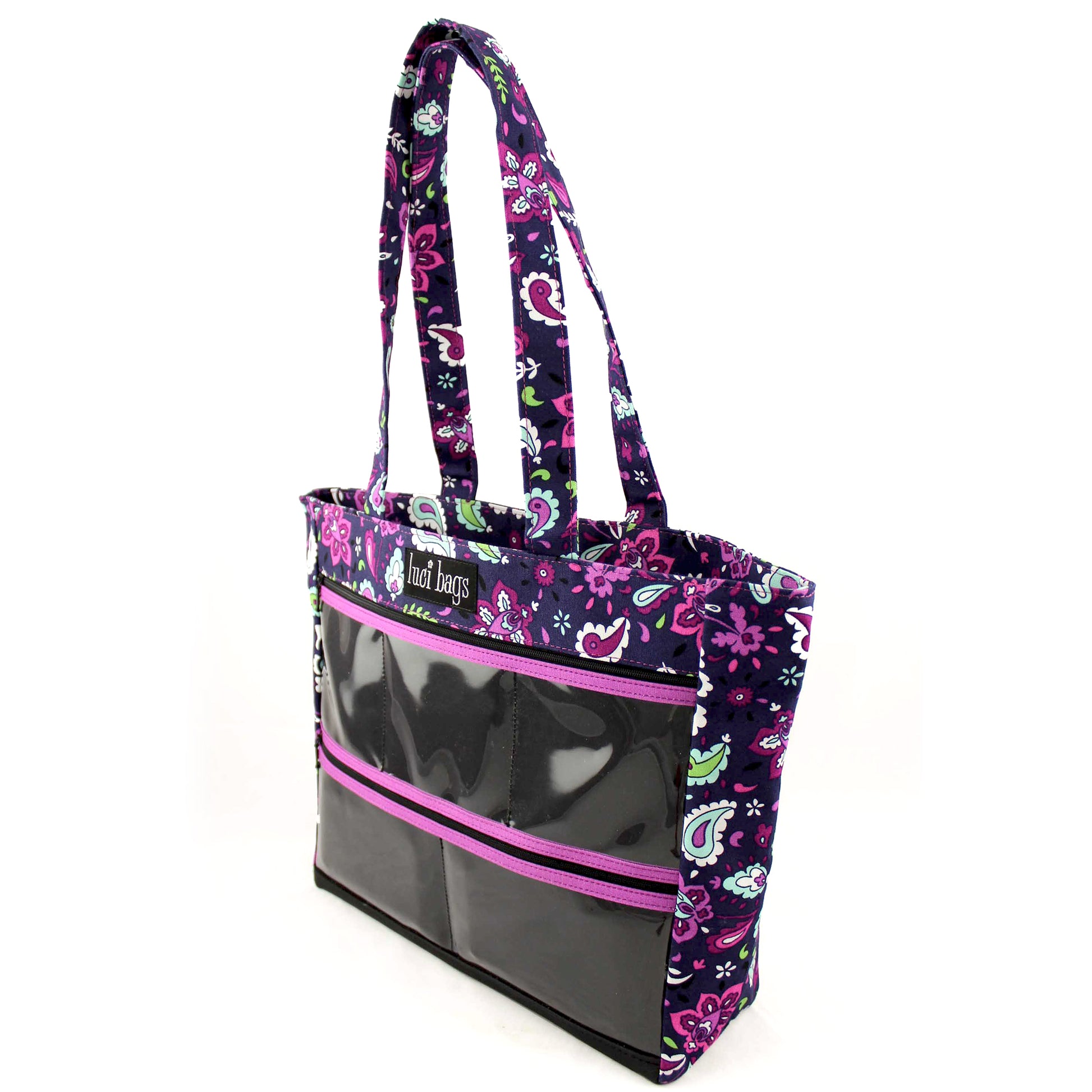 Materials: A dark indigo background makes the vibrant colors of this paisley print POP! Plum purple accents. Black window background & faux leather bottom. Silver magnetic snap closure.