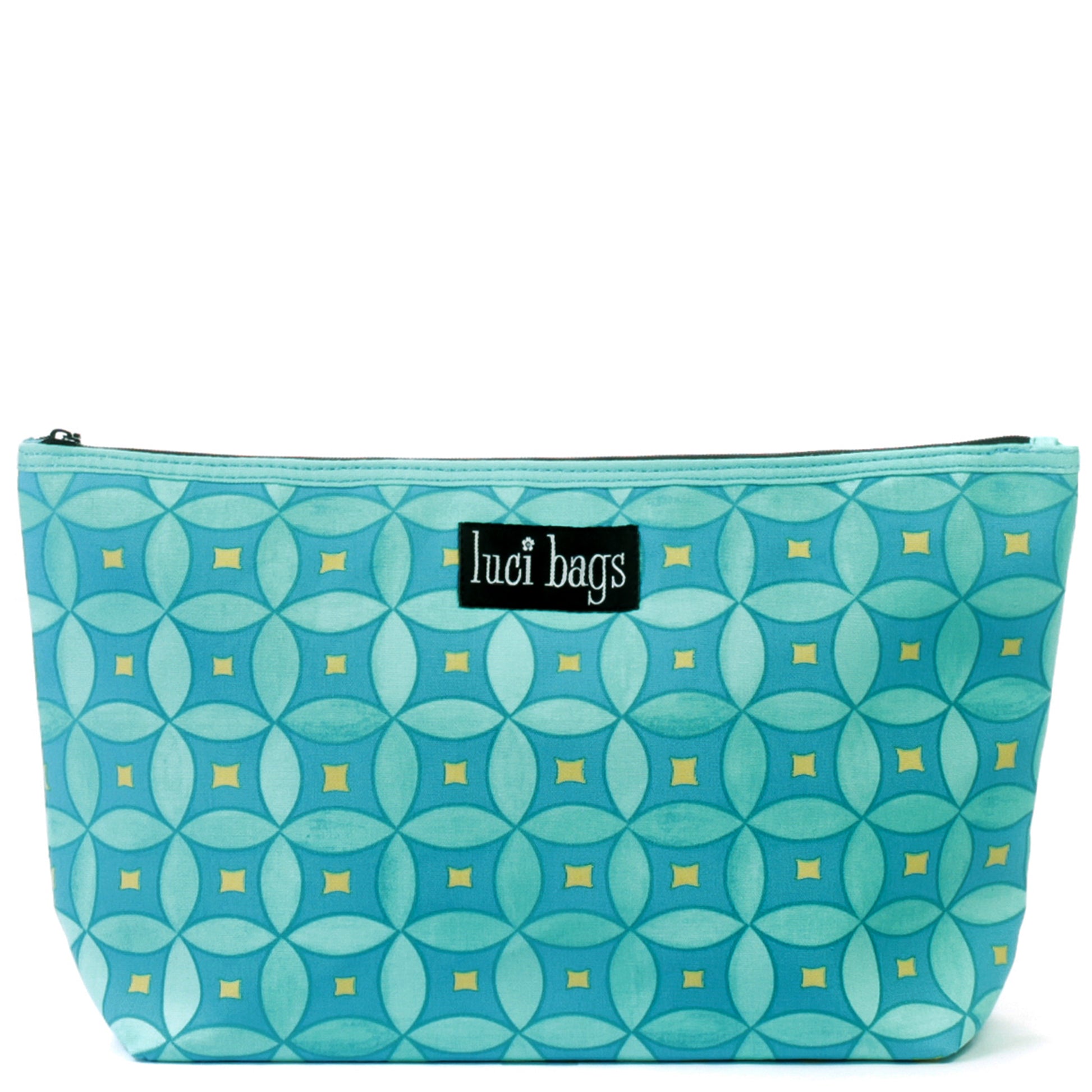 Materials: This watercolor print features circles of blue and turquoise with golden centers. Light turquoise accent. Zip closure. One interior zipped pocket.