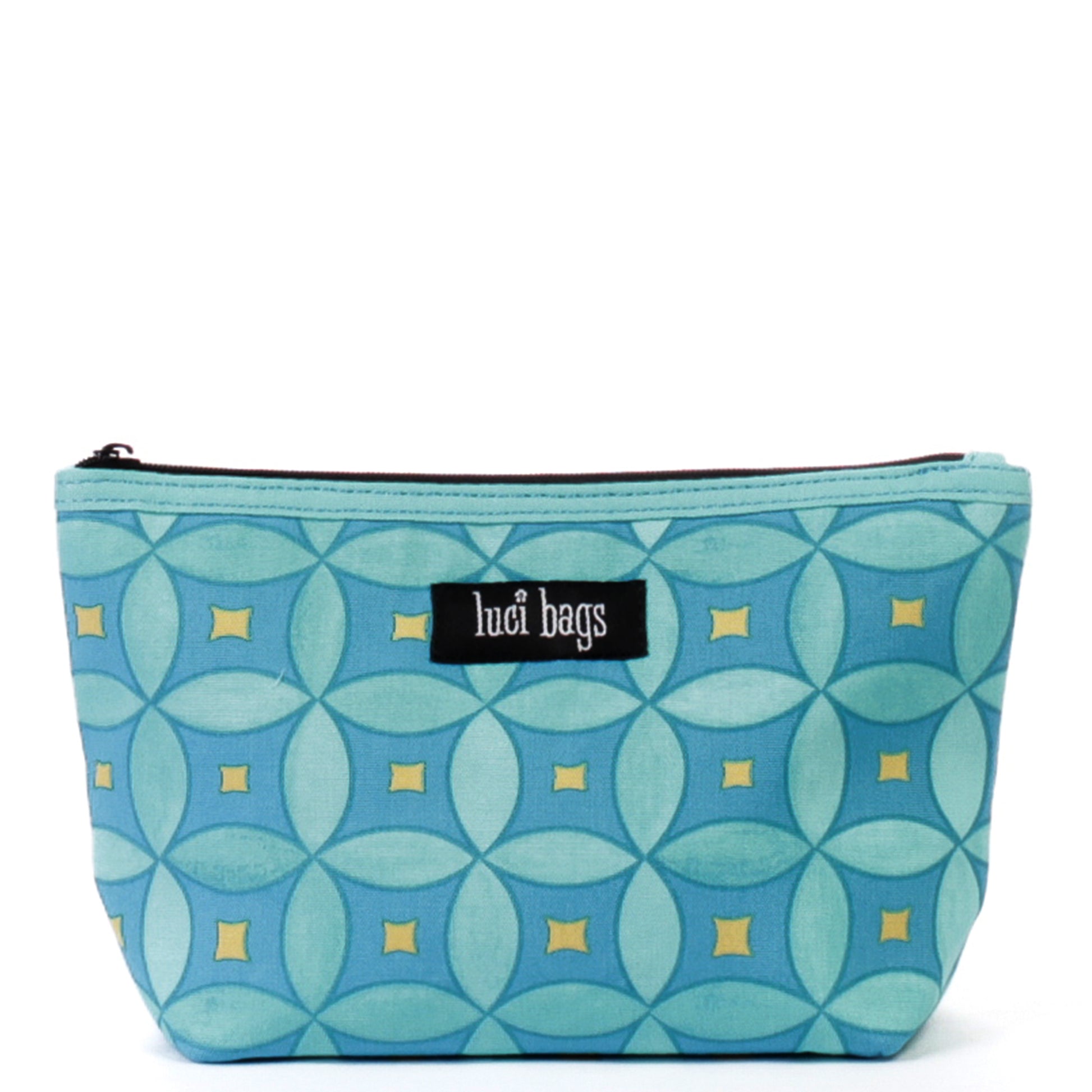 Materials: This watercolor print features circles of blue and turquoise with golden centers. Light turquoise accent. Zip closure.