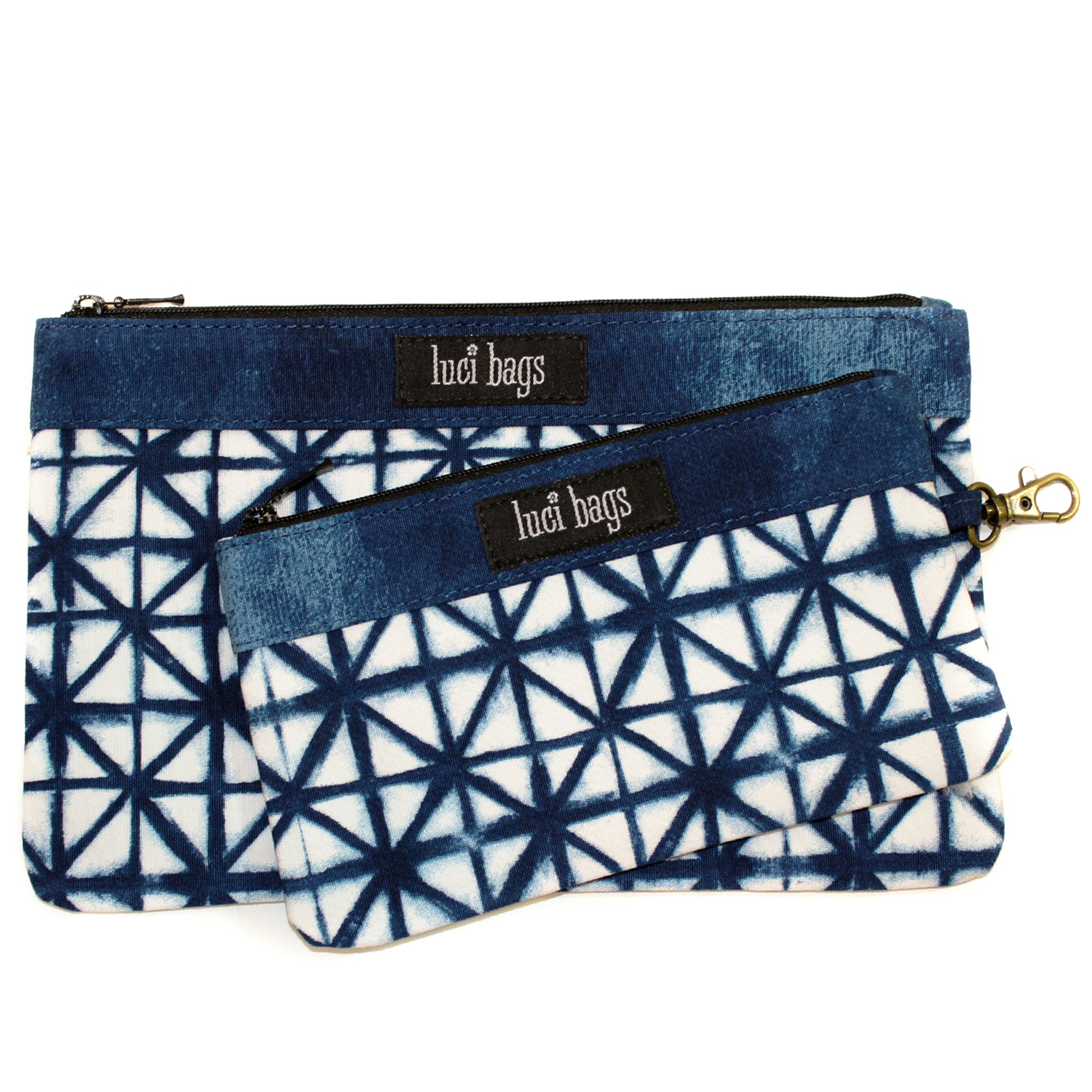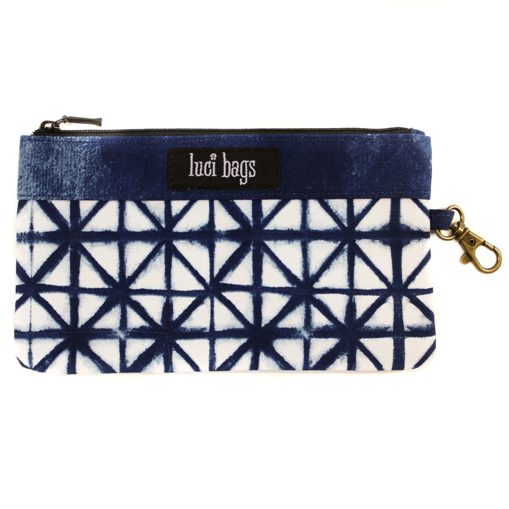 Materials: A traditional blue and white shibori pattern printed on our durable cotton. Distressed indigo accent. Zip closure. Antique bronze claw clasp. Interior Pocket.