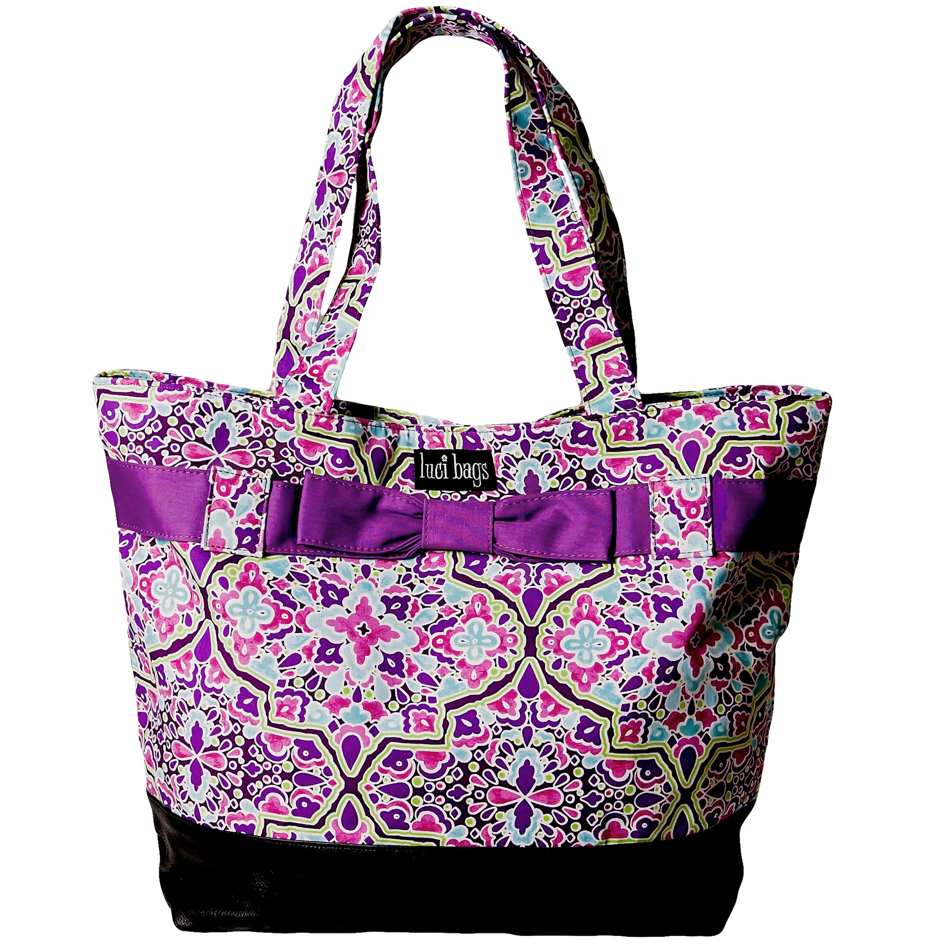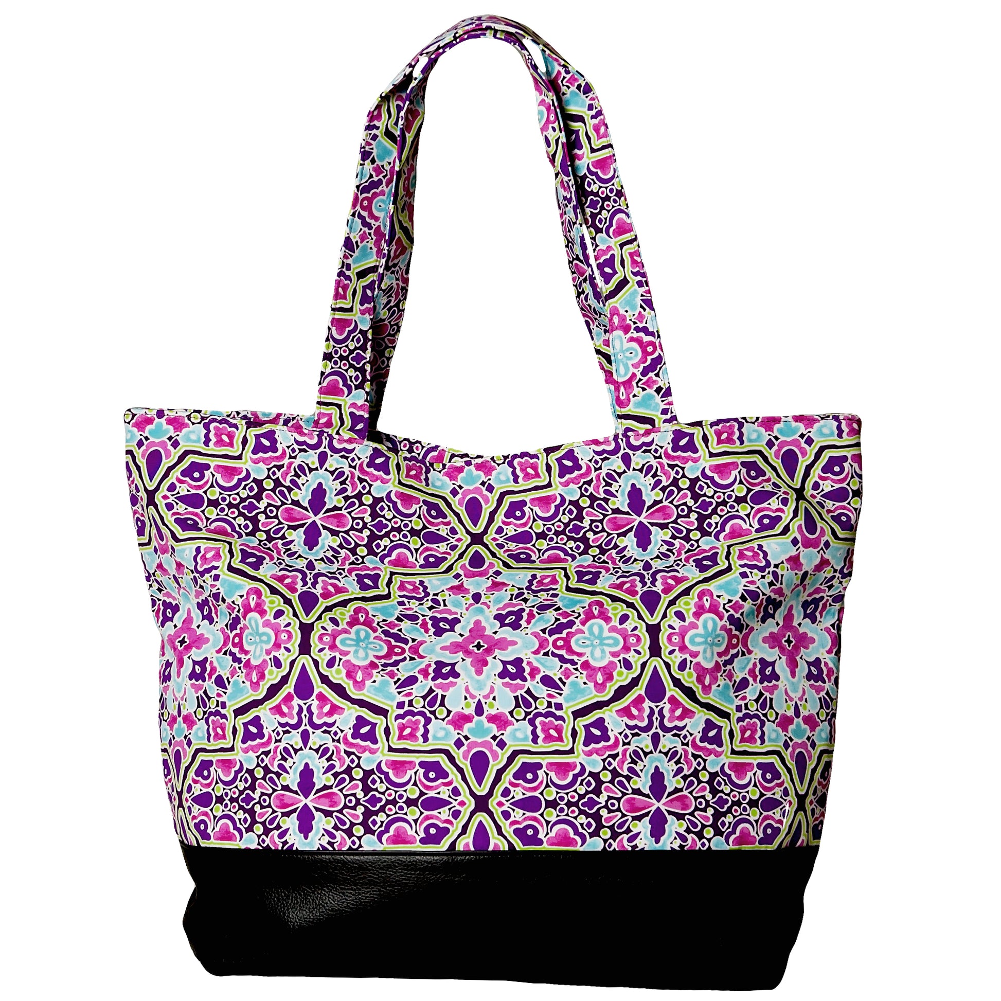 Materials: A delightful kalediscope of purple, pink, sky blue and green. Purple accent. Zip closure.
